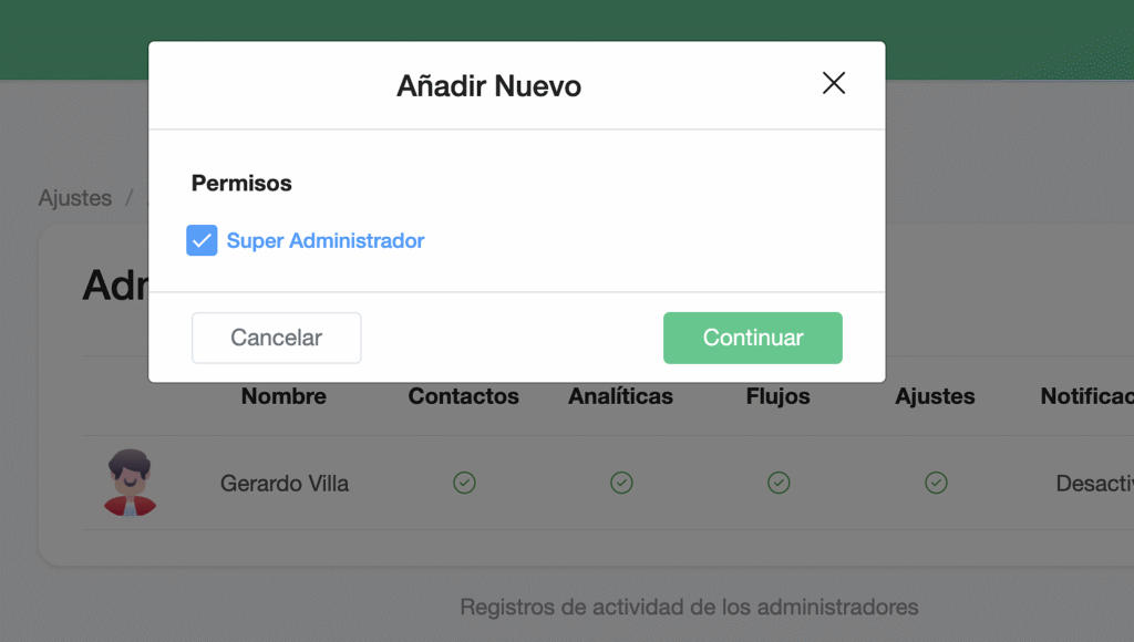 Debes tener mucho cuidado al crear un usuario de tipo Super Administrador, ya que este permiso permite al usuario tener los mismos privilegios que tu, incluso borrar la cuenta de la empresa, borrar contactos o borrar otros usuarios.