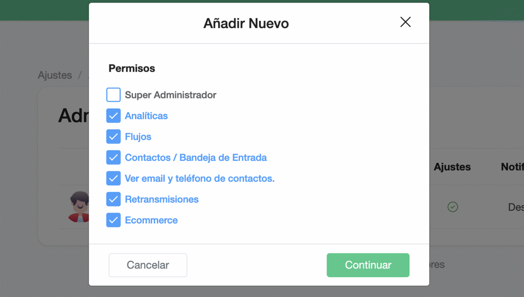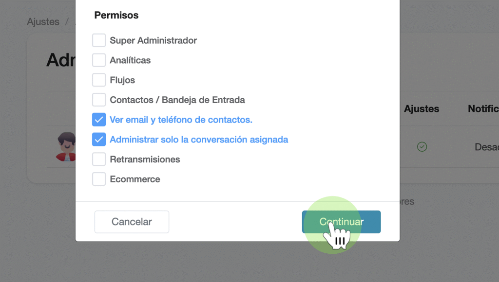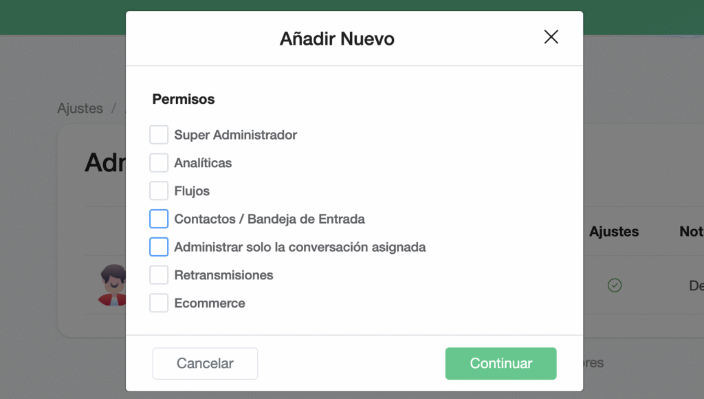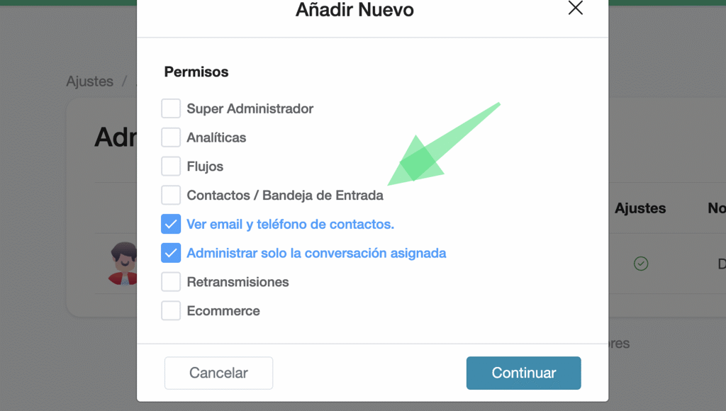 Si deseas crear un usuario supervisor, que pueda ver/monitorear todas las conversaciones de la cuenta, debes seleccionar la opción Contactos / Bandeja de Entrada