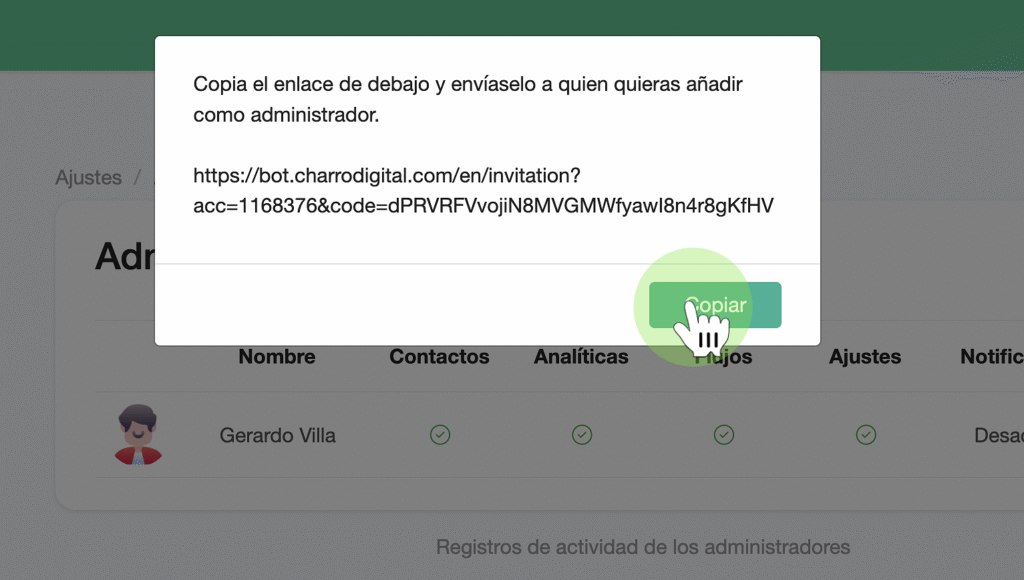 Esto generará un enlace de invitación para que puedas compartirlo con la persona de tu equipo que deseas invitar a tu cuenta.